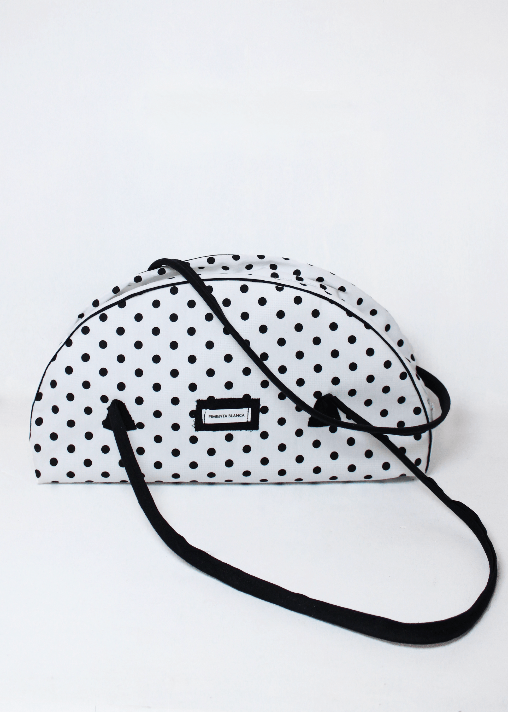 El bolso Bobo White destaca por su original forma de media luna en popelín blanco con lunares negros. Este bolso de lunares hecho a mano es más espacioso de lo que parece a primera vista, perfecto para llevar todo lo esencial con un estilo único y festivo.